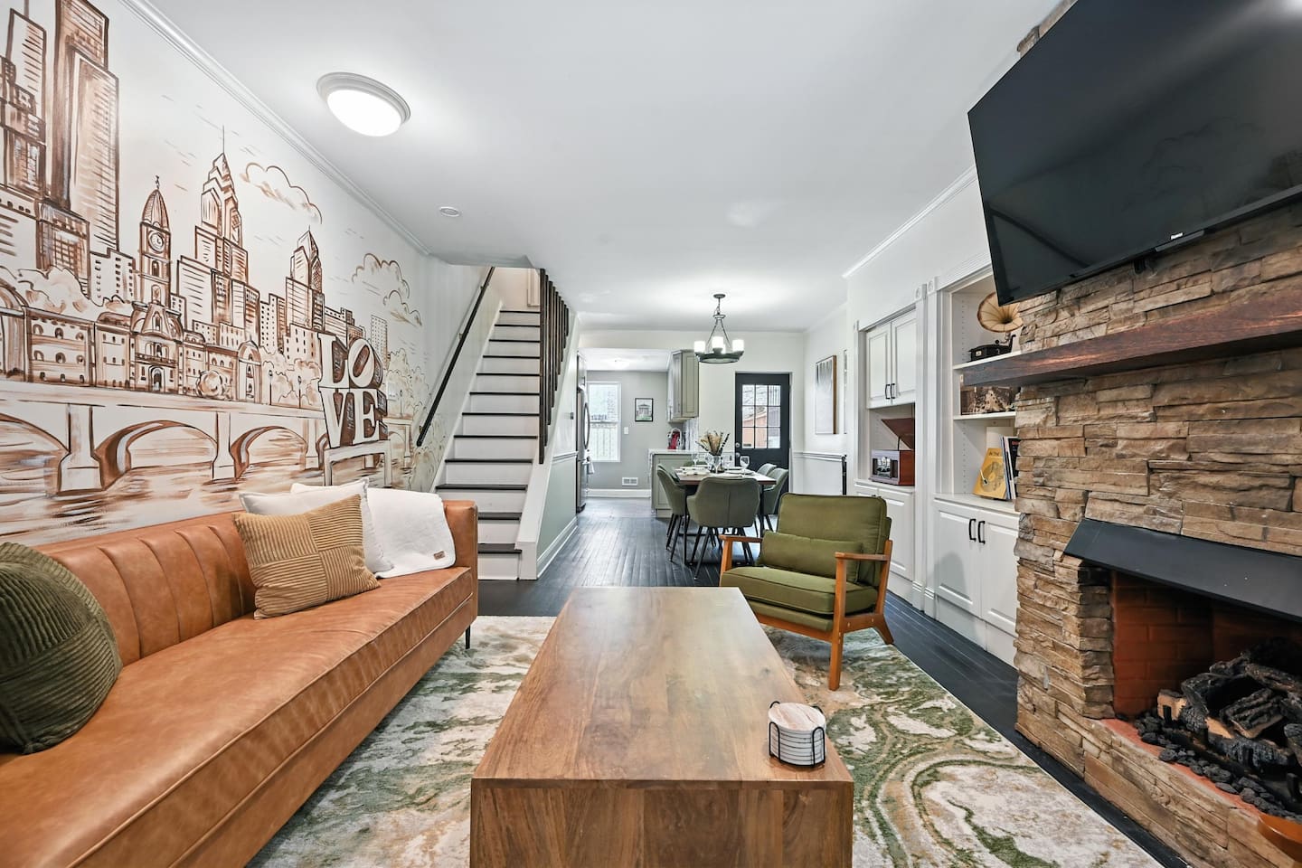 Welcome to the Cobblestone Retreat! This charming historic rowhouse is located on a picturesque cobblestone street in the heart of Philadelphia. Just steps from Rittenhouse Square, museums, and top cafés, this beautiful home combines timeless elegance with modern comforts. Enjoy a cozy living space, fully equipped kitchen, and a private outdoor patio with a chiminea. Perfect for romantic getaways or remote work, it offers fast Wi-Fi, smart TVs, and keyless entry for a seamless stay.